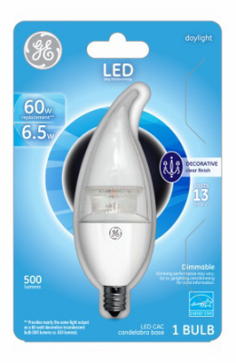 GE, LED7DCAC-C35K/OT120, 7W, Daylight Clear, CAC Shape, LED Light Bulb, Equivalent To A 40W Incandescent, Dimmable, Candelabra Base, 500Lumens, 5000 Color Temperature, 4" MOL, 15,000 Hours Rated Life, Carded.